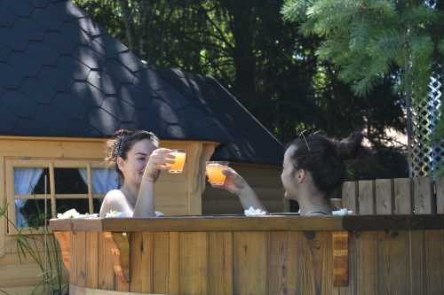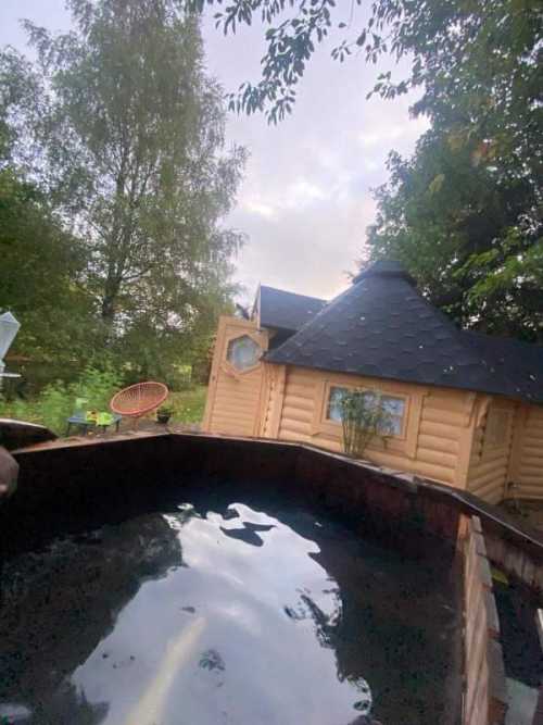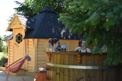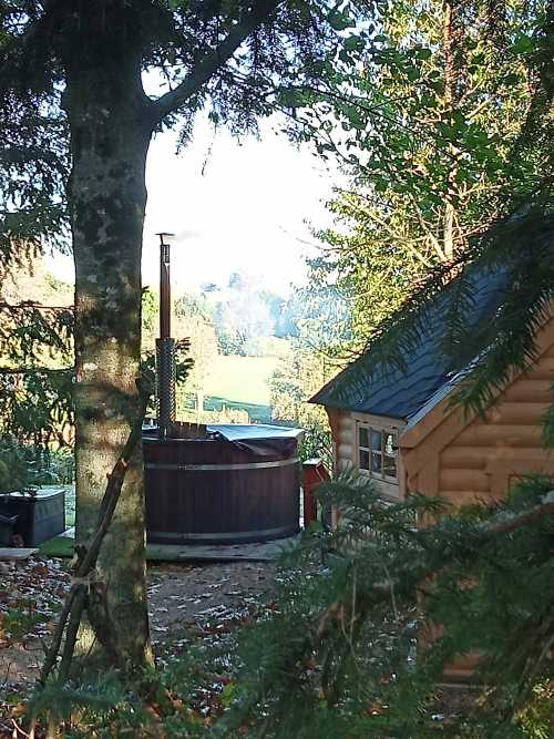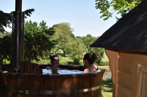 Le bain est situé sur la terrasse de la cabane hébergement. Nous assurons un séjour sans vis-à-vis grâce aux arbres, haies et autre végétation qui ornent ce grand jardin. Le respect du calme des lieux est donc indispensable pour permettre à tous, de passer un bon moment!